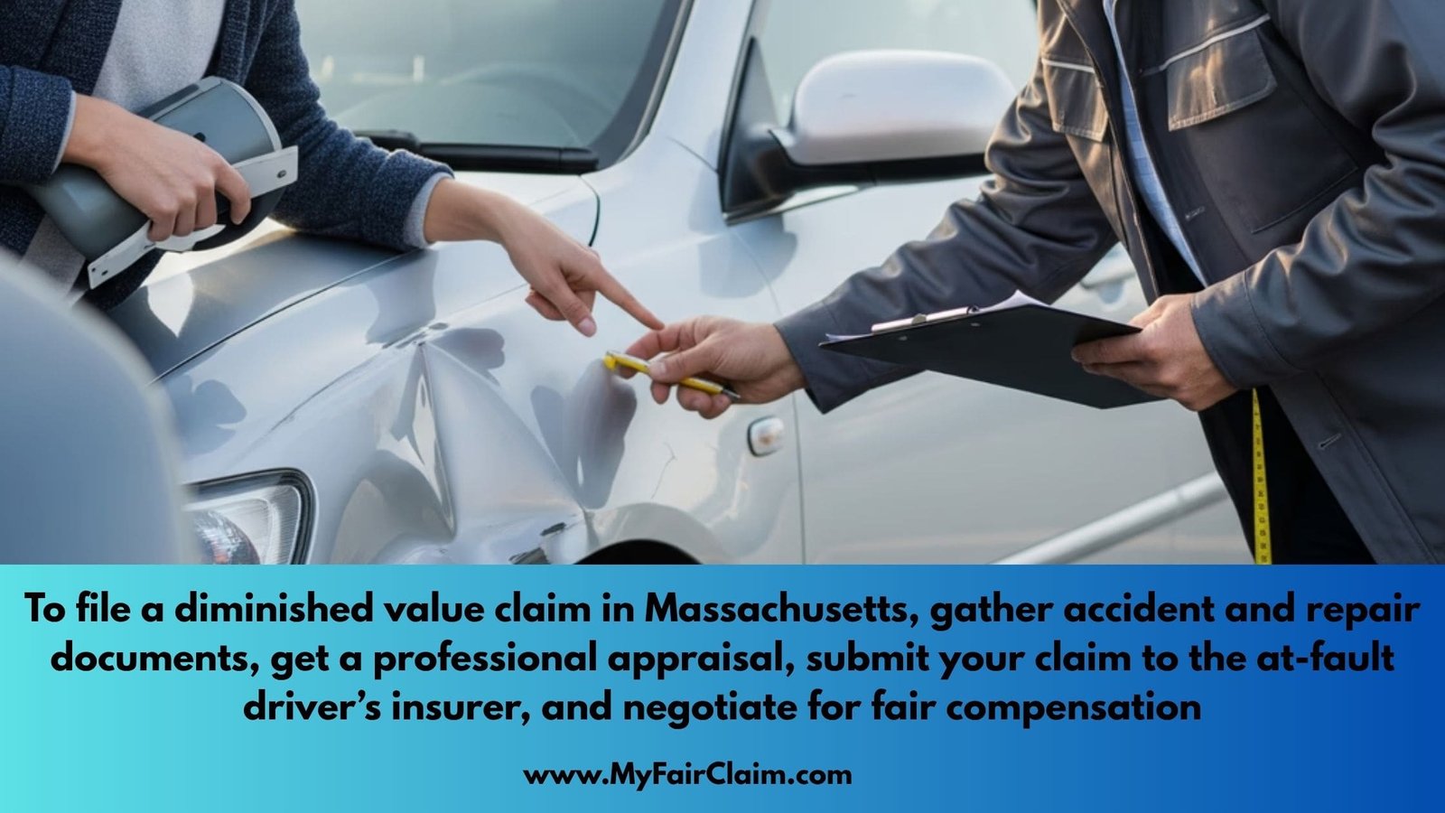 To file a diminished value claim in Massachusetts, gather accident and repair documents, get a professional appraisal, submit your claim to the at-fault driver’s insurer, and negotiate for fair compensation. You have up to three years from the accident date to file.